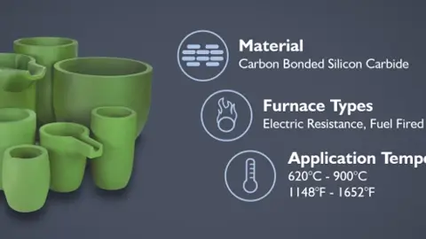 Excel E crucibles are available in a comprehensive range of shapes and sizes to suit most end user requirements. Custom sizes can be supplied by special request. Pyrometer hole in the wall and pyrometer pocket configurations are available to facilitate accurate measurement of metal temperature. A selection of fixed pouring spouts with optimised profiles is offered where required for tilting furnace applications. Excel E crucibles can be supplied with our unique coating system, which can assist with metal cleanliness and prevention of dross adhesion.